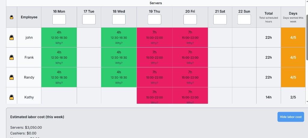 Set your assignment style (Strict Seniority, Balanced, or Fair Distribution), define labor pools (e.g. Servers, Cashiers, Housemen), set per-employee AM/PM and day preferences, max days per week, and how to handle duplicate names. The scheduler follows your rules.